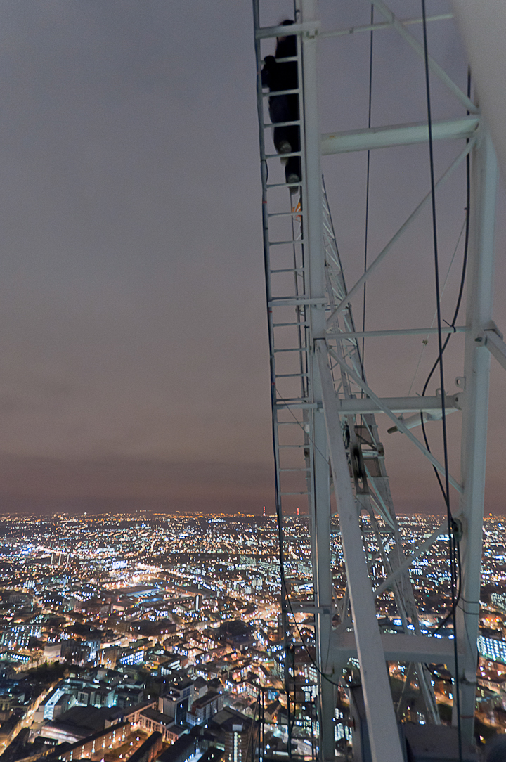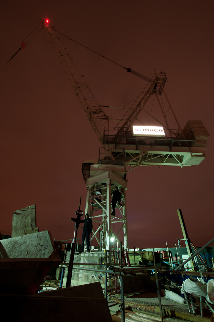 As I climbed up on the counterweight of the crane, my breath caught. It was a combination of the icy wind and the sheer scale of the endeavor that shocked me. Marc was looking down at London Bridge station and whispered, “the train lines going into London Bridge look like the Thames, it’s all flow.” Slowly, I pulled myself to the end of the counter weight and peered over the edge. Indeed, we were so high, I couldn’t see anything moving at street level. No buses, no cars, just rows of lights and train lines that looked like converging river systems, a giant urban circuit board.