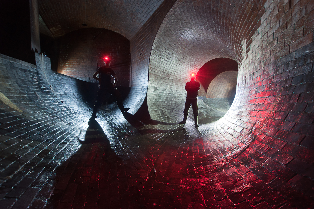 Otter, Yaz and I jumped into a sewer at Stockwell station and accidentally went upstream. I don’t know what we were doing but Yaz then says, “why don’t we just see what’s around the corner.” Ten minutes later, we were in one of the most beautiful drain junctions I have ever seen. Otter, in his style, spent 30 minutes setting up lights for this photo while Yaz and I danced in our waders to drum and bass.